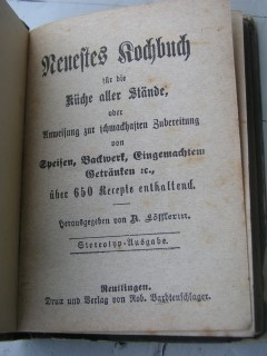 | 1573 | stereotyp ausgabe | deutsches | neuestes kochbuch für die küche aller stände od | charlotte löfflerin | enßlin u. laiblin, reutlingen | 1900 | * | 9,3 x 12,5 | 224 | 2345 | 5 | buntes bild - leinenrücken | | | |