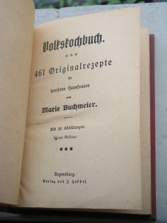 | 1624 | 4. | deutsches | volkskochbuch | marie buchmeier | josef habbel, regensburg | 1920 | | 12 x 17,4 | 239 | | 3 | schwarzer druck auf rot | | | |