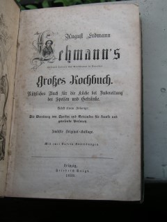 | 1626 | 12. | deutsches | großes kochbuch | a. erd. Lehmann | friedrich voigt, peipzig | 1859 | | 14 x 22 | 431 | 2250 | 5 | hardcover | | | |