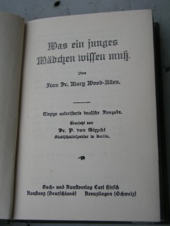 | 1707 | | haushalt | was ein junges mädchen wissen muß | dr. mary wood allen | carl hirsch, konstanz, kreuzlingen | 1910 | * | 12 x 17 | 283 | | 4 | goldener prägedruck auf grünem leinen | | | |