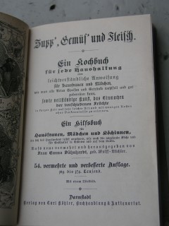 | 1708 | 54.vermehrte und verbesserte | deutsches | supp', gemüs' und flleisch - ein kochbuch für jede | emma dähnhardt | carl köhler, darmstadt | 1912 | | 12 x 17 | 416 | 665 | 5 | rücken geplatzt, goldene schrift, | | | |
