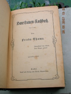 | 1709 | | deutsches | hausfrauen kochbuch | frieda thoma | druck und verlag von moritz schauenburg, lahr | 1900 | * | 12,5 x 18 | 424 | 3832 | 5 | neuer einband? | | | |