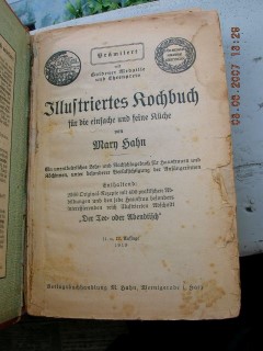| 1809 | 11+12. | deutsches | illustriertes kochbuch für die einfache und feine | mary hahn | verlagsbuchhandlung m. hahn, wernigerode i. harz | 1919 | | 14 x 21 | 661 | | 7 | bild mit schwarzem druck auf braunem karton | | | |