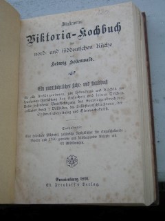 | 1881 | 1. | deutsches | illustriertes viktoria kochbuch | hewig hohenwald | ed. Frenhof's verlag, oranienburg | 1891 | | 13 x 19 | 694 | 1666 | 4 | goldprägedruck | | | |