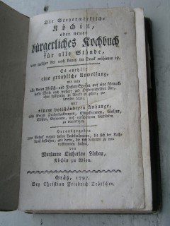 | 1886 | 1. | steirische | die steyermärkische köchin, oder neues bürgerliches kochbuch für alle stände | marianna catharina lindau - köchin zu wien | christian friedrich trötscher, grätz | 1797 | | 12 x 19 | 343 | 2322 | 5 | prägedruck am rücken | | | |