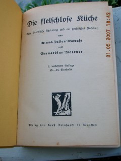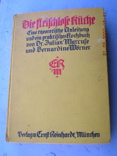 | 276 | 2. | vegetarische | die fleischlose küche | julian marcuse und b. woerner | ernst reinhardt in münchen | 1935 | * | 14 x 19,5 | 455 | | 5 | schwarz roter prägedruck auf gelben karton | | | |