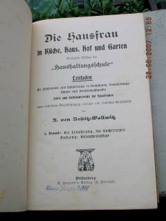 | 282 | 1. | haushalt | die hausfrau in küche, haus, hof und garten | a. von nostitz wallwitz | r. herrose's verlag, wittenberg | 1906 | | 15 x 22,3 | 212 | 2838 | 5 | schwarzer druck auf karton | | | |
