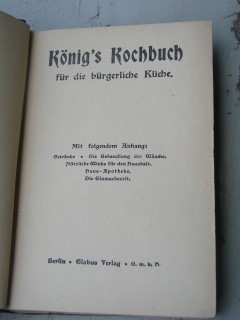 | 16 | | deutsche | könig's kochbuch für die bürgerliche küche | | globus verlag berlin | 1890 | * | 12,5 x 18 | 323 | 2056 | 3 | blau - gollddruck | | | |
