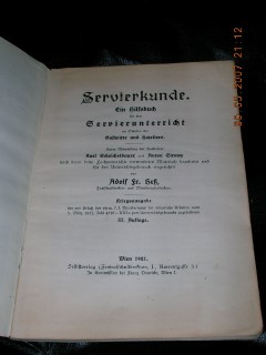| 288 | 3. | servierkunde | servierkunde - ein hilfsbuch für den servierunterr | adolf fr. heß - karl scheichelbaue und anton girowy | selbstverlag - zentralschuldirektion | 1921 | | 15,2 x 22 | 132 | | 4 | weißer druck auf braunem karton | | | |