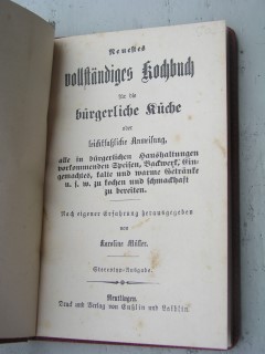 | 348 | | deutsches | neuestes vollständiges kochbuch für die bürgerlich | karoline müller | druck und verlag von enßlin und laiblin, reutlingen | 1890 | * | 11,5 x 17 | 96 | 2627 | 3 | golddruck auf rotem karton | | | |