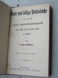 | 350 | | deutsches | gute und billige volksküche | l. von pröpper | druck und verlag von enßlin und laiblin, reutlingen | 1880 | | 10,7 x 16 | 96 | 3054 | 3 | golddruck auf rotem karton | | | |