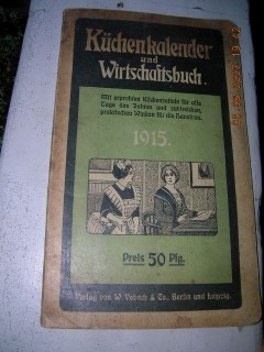 | 395 | | deutsches | küchenkalender und wirtschatsbuch | | w. vobach & co., berlin, leipzig | 1915 | | 16 x 26,7 | 140 | | 5 | schwarz grüner ruck auf karton | | | |