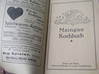 | 436 | | maingau | kochbuch für den maingau | die verfasserin | rückziegel & ketzler gmbh aschaffenburg | 1915 | * | 14,3 x 22 | 80 | | 6 | schwarzer druck geklebt | | | |