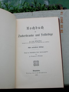 | 441 | | diät | kochbuch für zuckerkranke und fettleibige | f. von winckler | j.f.bergmann, wiesbaden | 1912 | | 13,2 x 19,4 | 220 | 4219 | 4 | weißer druck auf rotem leinen | | | |