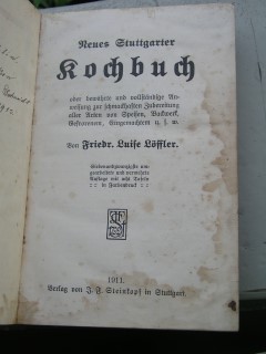 | 443 | 27. | stuttgarter | neues stuttgarter kochbuch | friedr. Luise löffler | j.f. steinkopf, stuttgart | 1911 | | 14 x 20,8 | 540 | 2350 | 4 | schwrz weißer druck auf grünem leinen | | | |