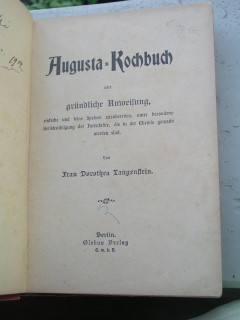 | 573 | | deutsches | augusta kochbuch oder gründliche anweisung, einfac | dorothea langenstein | globus verlag g.m.b.h., berlin | 1890 | * | 14 x 20 | 432 | 2233 | 5 | schwarzer druck auf rotem karton | | | |