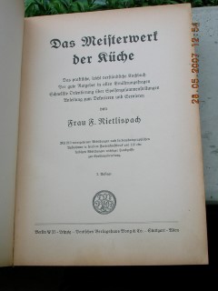 | 53 | 3. | deutsches | das meisterwerk der küche | frau f. nietlispach | deutsches verlagshaus bong & co., stuttgart | 1932 | | 18 x 25 | 672 | | 4 | goldprägedruck auf gr. Leinen | | | |
