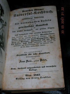 | 589 | 4. | wiener | neuestes wiener universal kochbuch | anna dorn | franz tendler | 1845 | | 12,5 x 19,5 | 544 | 799 | 5 | goldprägedruck auf lederrücken | | | |