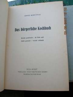 | 590 | | deutsches | das bürgerliche kochbuch | grete boruttau | süd west verlags- und vertriebs gmbh, marbach/neckar | 1935 | * | 15,5 x 22,3 | 384 | | 4 | golddruck auf grünem leinen | | | |