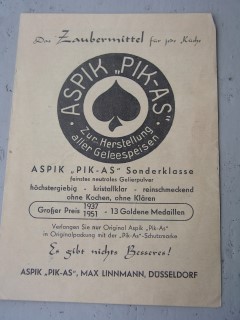| 680 | | pik as | das zaubermittel für jede küche | max linnmann | aspick "pik as", düsseldorf | 1951 | | 10,7 x 15,3 | 3 | | 4 | gefaltet | | | |