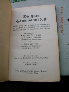 | 707 | 13. | hausmannskost | die gute hausmannskost | eugenie erlewein, lotte willich | carl aug. seyfried & comp. München | 1927 | | 12,5 x 19 | 133 | | 5 | leinenrücken | | | |