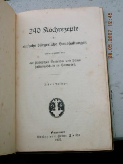 | 62 | 10. | hannover | 240 kochrezepte für einfache bürgerliche haushaltu | | verlag von heinr. Feesche,hannover | 1932 | | 12,5 x 19 | 81 | | 5 | schwarzer druck auf ocker karton | | | |