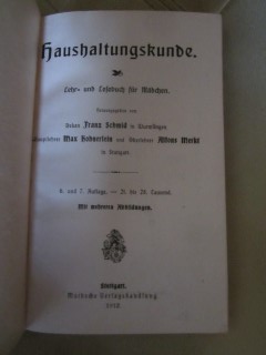 | 7908 | 6. | haushalt | haushaltungskunde - lehr- und lesebuch für mädchen | f. schmid, m. hohnerlein, a. merkt | muthsche verlagshandlung, stuttgart | 1912 | | 12,5 x 19,8 | 286 | | 4 | schwarzer druck auf ocker leinen | | | |