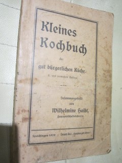 | 7936 | 2. u. verm | deutsches | kleines kochbuch der gut bürgerlichen küche | wilhelmine haibt | heuberger bote, spaichingen | 1929 | | 14,4 x 22,2 | 169 | | 5 | taschenbuch schwarzer druck, soft | | | |