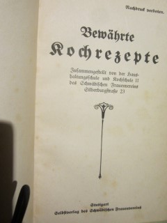 | 7935 | 1. u. einzige | schwäbische | bewährte kochrezepte | haushaltungsschule und kochschule | schwäbischer frauenverein | 1910 | * | 14,8 x 21,8 | 206 | | 5 | schwarzer druck,papp, grüner leinenrücken | | | |