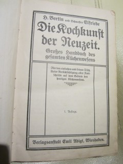 | 8015 | 1. | deutsches | die kochkunst der neuzeit - großes handbuch des gesamten küchenwesens | h. bertin und schwester elfriede | verlagsanstalt emil abigt, wiesbaden | 1898 | | 14,4 x 21,5 | 732 | 337 | 4 | golddruck auf rotem leinen | | | |