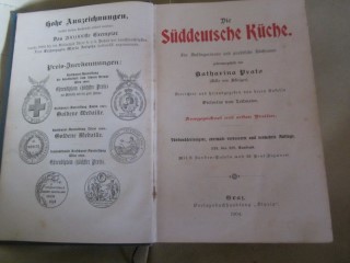 | 8039 | 35. | steirisches / österreichisches | die süddeutsche küche | katharina prato | verlagsbuchhanlung styria, graz u. wien | 1904 | | 14,1 x 21,9 | 839 | 3036 | 5 | goldprägedruck auf blau/grünem leinen | | | |