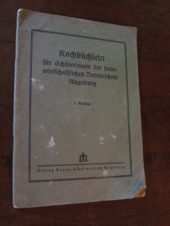 | 8100 | 1. | augsburg | kochbüchlein für schülerinnen der hauswirtschaftlichen berufsschule augsburg | | verlag bayer, schulmuseum augsburg | 1935 | * | 14,9 x 21 | 30 | | 6 | schwarzer druck, titelseite+1+2 seiten fehlen | | | |