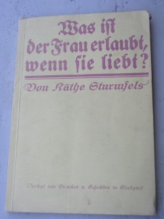 | 834 | | haushalt | was ist der frau erlaubt, wenn sie liebt? | käthe sturmfels | strecker u. schröder in stuttgart | 1919 | | 12,3 x 18 | 94 | | 5 | paperback, brauner druck auf gelb | | | |