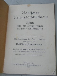 | 833 | | krieg | badisches kriegskochbüchlein - winke für die hausf | emma wundt, badischer frauenverein | c.f. müllersche hofbuchhandlung m.b.h. | 1915 | | 12,2 x 17,8 | 48 | 4300 | 5 | geheftet, lauer druck | | | |