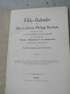 | 836 | | deutsches | tisch kalender für hr anton philipp reclam | doctor gormandisiä karma | leipzig | 1877 | | 12,7 x 19,2 | 30 | | 4 | paperback | | | |