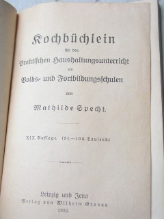 | 837 | 19. | deutsches | kochbüchlein für den praktischen haushaltungsunter | mathilde specht | wilhelm gronau, leipzig und jena | 1922 | | 12,5 x 18 | 96 | | 5 | paperback | | | |