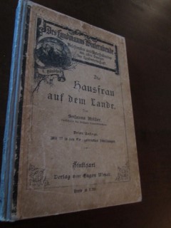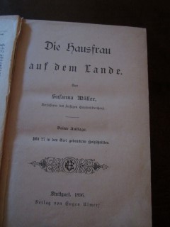 | 8382 | 3. | haushalt | die hausfrau auf dem lande | susanna müller | eugen ulmer, stuttgart | 1896 | | 11,4 x 17 | 195 | 2637 | 4 | schwarzer druck, grauer leinenrücken | | | |