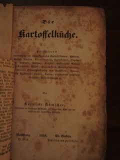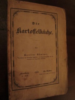 | 8386 | 1. | erdäpfel | die kartoffel küche | karoline kümicher | meck, constanz / scheitlin & zollikofer, st. gallen | 1848 | | 12,3 x 19 | 96 | 2162 | 5 | taschenbuch, soft, schwarz | | | |