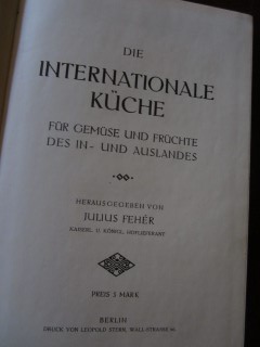 | 8389 | 1. | international | die internationale küche für gemüse und früchte des in- und auslandes | julius feher, kaiserl. U. königl. Hoflieferant | leopold stern, berlin | 1910 | | 13,2 x 19,7 | 240 | 1016 | 4 | goldprägedruck auf grünem leinen | | | |