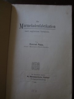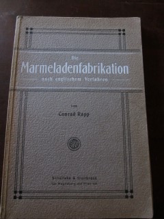 | 8390 | 1. | marmeladen | die marmeladenfabrikation nach englischem verfahren | conrad rapp, eheml. Marmeladen fabrik direktor | schallehn & wollbrück, wien | 1906 | | 16,2 x 24,5 | 124 | 3104 | 3 | taschenbuch - weiß schwarzer druck | | | |