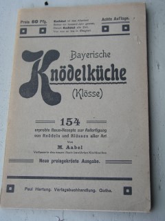 | 841 | 8. | knödel | bayerische knödelküche (klösse) | m. aabel | paul hartung, gotha | 1905 | | 12,8 x 19,5 | 48 | 5 | 5 | paperback | | | |