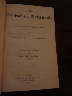 | 8594 | 1. | diät | neues kochbuch für zuckerkranke | bernhardine freiin von großschedel | theodor ackermann, münchen | 1902 | | 13 x 19,6 | 98 | 1314 | 3 | goldprägedruck auf blauem leinen | | | |