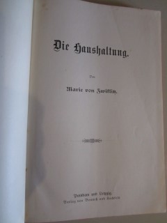 | 8596 | 1. | haushalt | die haushaltung | marie von zwiklitz | bonneß und hachfeld, potsdam | 1898 | | 16,7 x 25,3 | 140 | 4363 | 3 | golddruck-roter leinenrücken | | | |