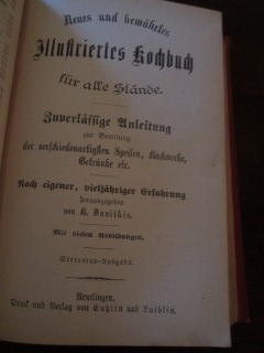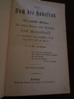 | 8609 | neue stereotyp | deutsches | das buch der hausfrau - eine praktische anleitung für junge frauen und mädchen, den haushalt in vorteilhafter und praktischer weise einzurichten und zu führen | lovica edle von pröpper | enßlin & laiblins verlagsbuchhandlung | 1896 | | 11,2 x 17,8 | 160 | 3045 | 5 | goldprägedruck auf rotem leinen | | | |