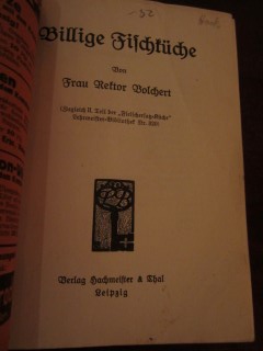 | 8628 | 2.teil | fisch | billige fischküche | frau rektor volchert | hachmeister & thal, leipzig | 1914 | | 11,6 x 16,6 | 50 | 3982 | 4 | taschenbuch - lehrmeister bibliothek nr. 350-351 | | | |