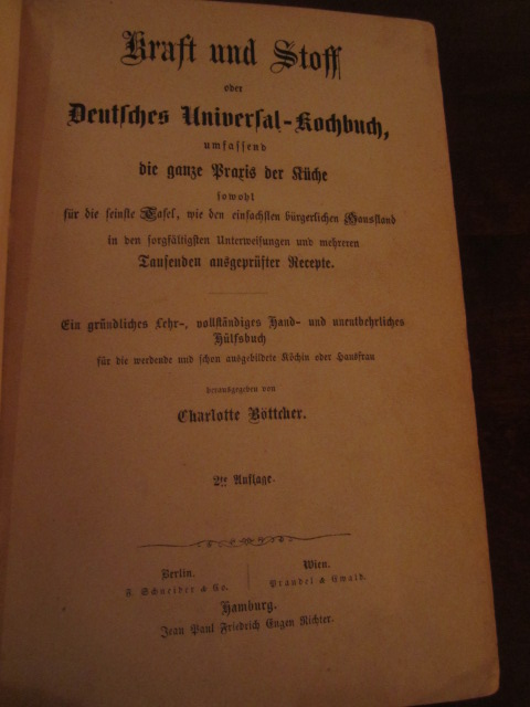 | 8630 | 2. | hamburger | kraft und stoff oder deutsches universal kochbuch umfassend die ganze praxis der küche sowohl für die feinste tafel, wie den einfachsten bürgerlichen hausstand in den sorgfältigsten unterweisungen und mehreren tausenden ausgeprüfter recepte. | charlotte böttcher | jean paul friedrich eugen richter, hamburg | 1863 | | 14 x 20,5 | 1230 | 443 | 5 | golddruck auf lederrücken und ecken | | | |