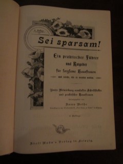 | 8635 | 6. | haushalt | sei sparsam - ein praktischer ratgeber für sorgsame hausfrauen | anny wothe | adolf mahn, leipzig | 1900 | | 16,5 x 23 | 384 | 4296 | 4 | bunter druck auf grünem leinen | | | |
