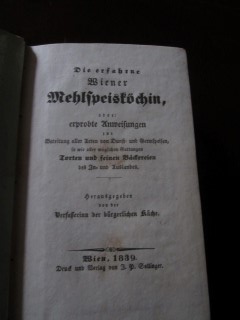 | 8638 | 1. | wiener | die erfahrene wiener mehlspeisköchin, oder erprobte anweisungen zur bereitung aller arten von dunst= und germspeisen, sowie aller möglichen gattungen torten und feinen bäckereien des in= und auslandes | (elisabeth stöckel) | j. p. sollinger, wien | 1839 | | 11,7 x 18,1 | 360 | ???? | 4 | schwarzer druck auf papp | | | |