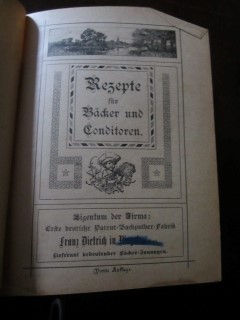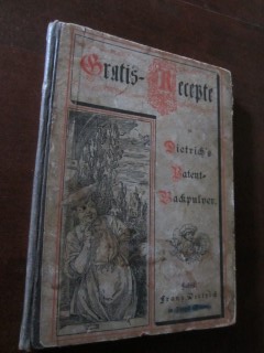 | 8675 | 4. | dietrich | gratis recepte zu dietrich's patent=backpulver | | fabrik: franz dietrich in riegel (baden) | 1901 | | 13 x 17,5 | 140 | ??? | 5 | rot-schwarzer druck auf papp, brauner leinenrücken | | | |