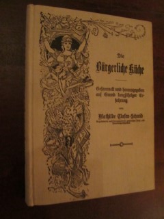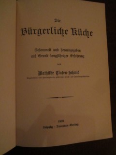 | 8679 | | deutsche | die bürgerliche küche | mathilde clasen schmid | teutonia verlag, leipzig | 1908 | | 14,4 x 19,8 | 143 | 616 | 3 | schwarzer druck auf hellem leinen | | | |